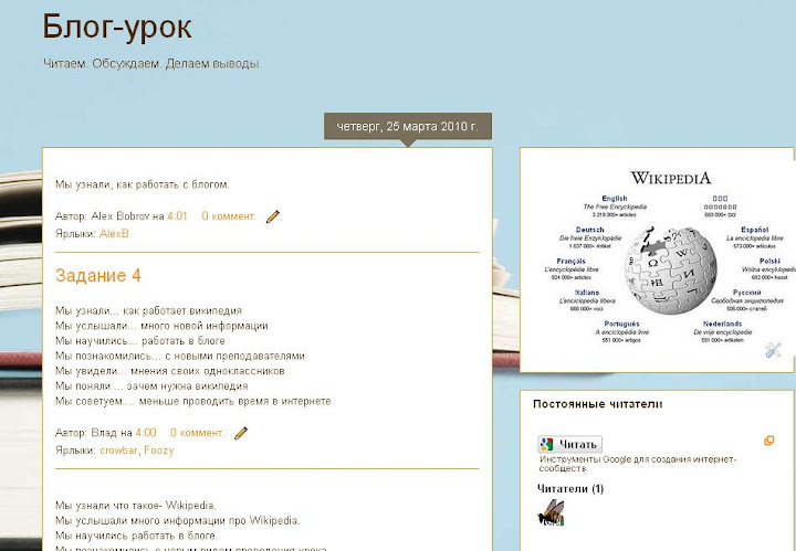 Блог-урок - это реально! (Как организовать и провести 45-минутный урок на блоге) Блог тренера / 08.01.2011 Как такой урок был задуман? Предпосылки... На самом деле, тот урок, который я собираюсь описать, был для нас не самым первым "уроком на блоге". Идея родилась несколько раньше, во время подготовки к учительской конференции "Совместная работа учителей в Сети", проходившей в Таллинне в ноябре 2009г. Формат такой конференции обычно предусматривает максимальное число активных форм обмена знаниями: активные лекции, мастер-классы, баркэмпы и т.д. Мы теперь часто используем именно такие формы на конференциях, поскольку очень здорово на практике испытать, как работают идеи приобщения и вовлечения! А еще так хорошо ощущается энергетическая заряженность непосредственного обмена информацией и идеями! Взамен докладов, выступлений и прочих "сообщений участников"... Одним из совсем новых для нас форматов стал "урок на блоге". Этот урок - для учителей. Проходит в компьютерном классе, имитирует ситуацию "учитель-предметник привел учеников в компьютерный класс". По своей сути - это самый настоящий мастер-класс, цель которого - моделировать содержательное общение в Интернете. Вызов для учителя, участвующего в блог-уроке, - демонстрация в действии новых возможностей виртуального общения для организации урока. А еще он направлен на разрушение стереотипов ведения урока - когда преобладает учитель. Побочная задача - снять некоторые страхи учителя, впервые задумавшего "испытание виртуалом" для своего класса, для себя, как профессионала, для своего предмета, наконец... Еще задачи мастер-класса "Урок на блоге": показать основную форму организации такого урока - обмен текстами; вовлечь участников в совместную работу на блоге, показать преимущества интерактивности; испытать различные приемы работы с текстами: "составление акронимов", "метод неоконченных предложений", "метод сократовских вопросов" и другие; расширить представление учителей о возможностях для развития креативности учеников на уроках практически любого предмета; продемонстрировать, что 45-минутный интервал времени вполне достаточен для этой формы урока в компьютерном классе. Это урок-тренажер, урок-проба! Не стоит судить его строго!В качестве пробного примера можно посмотреть один из таких уроков на блоге.ПРАКТИКУМ ДЛЯ УЧИТЕЛЕЙ ГУМАНИТАРНЫХ ПРЕДМЕТОВ.Структура блог-урока незамысловата: серия коротких заданий-инструкций, заранее разработанных и опубликованных в блоге учителем. Эти задания подразумевают выполнение в виде текстов (возможны и другие, мультимедийные, формы, но в данном случае временные рамки урока их применить не позволяли). Разумеется, к каждому ответу-посту возможно добавление комментариев от участников. Формы заданий - очень разнообразны, но обязательное условие - не рутинные (типа: вставьте пропущенные слова)! Хорошо, - скажете вы - это экспериментальный "урок" с учителями - взрослыми людьми! А возможен ли, например, подобный урок литературы (любого другого предмета) на блоге с детьми, а не с учителями? Таквот он, смотрите!Структура блог-урока "Учимся работать в блоге": Инициирующее сообщение "Подросток в Интернете" Задание 1 Задание 2 Задание 3 Задание 4 Использованная "наглядность" - кластер "Чем интересен Интернет?" Урок укладывается в "стандартные" 45 минут. Работают и включены на та