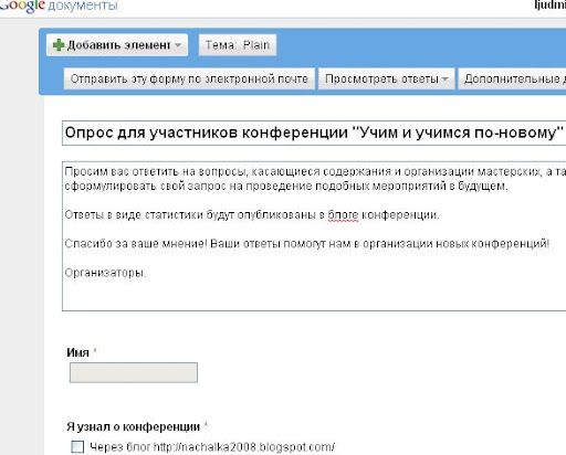 Обратная связь: как ее организовать без лишних затрат? Блог тренера / 08.11.2010 Этот пост для тех, кто пытался что-то организовать с участием других людей: семинар, конференцию, методические дни в своей школе.... То есть для активных авторов проектов и зачинателей новых дел. Но не только для них. Если Вы - школьный администратор, то организацией процессов обязательно занимаетесь ежедневно - от составления расписания до планирования и проведения педсоветов. И во всех этих случаях, как можно предположить, Вы бываете озабочены получением обратной связи от участников/партнеров. И Вам не просто интересно, но и полезно узнать, насколько любые ваши активность/мероприятие/проект были результативны и что надо будет предпринять в следующий раз, чтобы организовать подобное дело лучше и не повторить прежних ошибок.И Вы, с целью получения обратной связи, опрашивали участников в конце мероприятия устно или раздавали им листочки с заранее подготовленными вопросами? И потом дома вечерами пытались расшифровать чужие каракули или посчитать статистику положительных/отрицательных/нейтральных мнений?Все это наверняка с Вами было... Поэтому Вы знаете, каким трудоемким бывает процесс обработки собранных анкет, как много времени уходит на перевод сырых данных в электронный формат, чтобы можно было "прочитать" и интерпретировать собранные, таким образом, мнения.Оказывается, все описанное можно проделать гораздо проще, не тратя столько времени и усилий, как это бывает с "бумажным" анкетированием.Технологии сбора Бумажные опросы Электронные опросные формы Итак, для проведения разнообразных опросов сейчас есть замечательные инструменты! Это часть веб-сервиса Googledocs, а именно Googleforms.Привожу совсем небольшую инструкцию по работе с сервисом.Для начала нужно иметь Google-аккаунт.С его помощью авторизуетесь в сервисе Googledocs и приступаете к созданию опросника.Из набора инструментов Googledocs выберите "Форма"После выбора названия для своего опроса в следующем поле лучше всего коротко указать, кто и с какой целью проводит опрос и что потом будет с результатами, например, для чего их используют, где и когда их опубликуют?Не забудьте упомянуть в заголовке, является ли опрос анонимным, поскольку это может существенно повлиять на результат. Для разных целей - нужны разные, в этом плане, анкеты.Помните, что вопросы в опроснике могут быть закрытого (с вариантами выбора ответа) и открытого типа в виде "окошка", в которое, как Вы надеетесь, участники опроса выскажут особое мнение, пожелание или предложение:Теперь публикуем URL-адрес (ссылку) подготовленной для заполнения опросной формы на школьном сайте/блоге или действуем путем рассылки по электронной почте, если эта форма инфообмена приемлема для всех участников опроса.Ответы на вопросы Вашей анкеты автоматически преобразуются не только в готовую таблицу, но и в красивые круговые и столбчатые диаграммы. Не правда ли, очень наглядно?К написанному можно добавить, что с помощью Googleforms можно не только проводить опросы общественного мнения, но и вообще собирать какую-то иную информацию.Подробная инструкция "Создание тестов, опросов, анкет с помощью Гугл-форм" (автор Мария Смирнова)И еще одна от Марины Курвитс "Создание формы в Google form" Googledocs обратная связь опросники