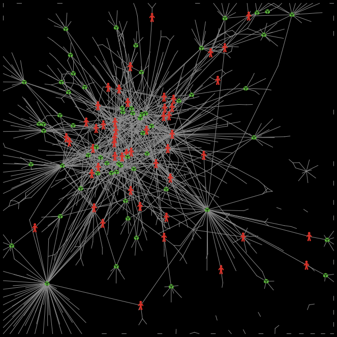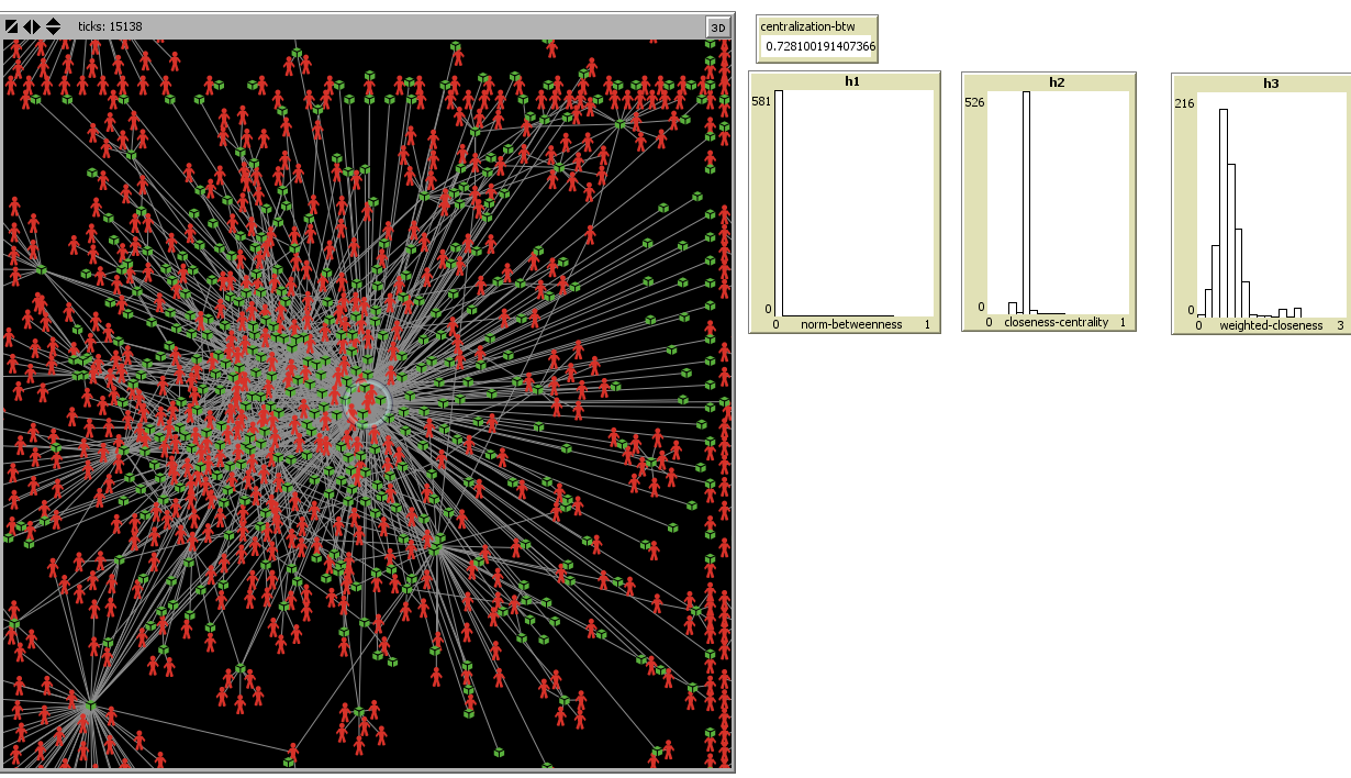 Большие данные - что полезного из них можно извлечь Блог стайного советника / 22.10.2014 Это сообщение - продолжение темы учебной аналитики, субъектной центрированности и сетевой центральности. А с другой стороны - это начало новой темы анализа и сравнения проектов совместной сетевой деятельности. Волею судеб у нас в руках одновременно есть:- открытые образовательные проекты, внутри которых агенты деятельности создают, редактируют страницы и оставляют записи о каждом своем действии; - есть агенты NetLogo, готовые по этим записям восстановить всю последовательность действий;- есть аппарат социального сетевого анализа, способный устанавливать меры центральности определять ключевых игроков.Вообще, мне кажется, что я тут наблюдаю и совершаю прорыв, но вполне может быть, что это иллюзия. Поэтому критические замечания коллег будут восприняты с благодарностью.Дальше я поставлю массу картинок, пугающих своей красотой и те, кому это покажется интересным, могут задавать вопросы и предлагать собственные интерпретации происходящего на экране.1. Картинка экран с черепахами, которые отображают историю одного из Летописных проектов. Я на мелкие цифры обращу внимание:ticks 15338 - это означает, что к этому моменту участники проекта совершили более 15 тысяч действий - созданий или редактирований статей.cenrtalization-betweenness = 0.728100 - это мера групповой центральности по посредничеству. Очень высокая степень свидетельствует о том, что центральность очень неравномерно распределена между участниками. Ну, это и так видно. Следующая картинка повторяет предыдущую, просто мы попросили показать ключевого игрока. Здесь самый ключевой - тот, у кого наивысшая степень центральности.А теперь мы попросим спрятаться всех тех, у кого степень центральности = 0.А теперь я удалю ключевого игрока (и степень групповой центральности упадет в 3 раза!)И опять попросим спрятаться тех, у кого центральность = 0А теперь мы уберем всех с нулевой центральностью и получим группу ключевых игроков (без удаленного на 3 ходу лидера)Расскажу о процессе изготовления, может быть кому-то пригодится:Берем на Летописи (пока еще только там) программу, которая из множества страниц категории извлекает историю их редактирования: letopisi.org/index.php/Special:HelloWorld/.Например, letopisi.org/index.php/Special::HelloWorld/Викимания_Саратов-Хабаровск.Получаем массу записей в виде "2006-03-02 09:06:49" "School 30" "Энгельс, город (Саратовская область)"Делаем сортировку по времени и отбрасываем временной столбец как далее ненужный. Делаем пока в Excel, хотя дальше этот шаг и предыдущие можно будет пропустить. Делаем в текстовом редакторе замену концов строк на "]\n["и в конце получаем в виде список в форме, пригодной для дальнейшего использования: ["Татьяна" "Советская_Гавань,_город_(Хабаровский_край)"]Теперь мы идем в Netlogo и подсовываем ему всю эту последовательность и просим черепах проиграть все происходящее на экране. Еще просим проследить за самыми центральными игроками (за теми, у кого максимальные центральности по посредничеству) watch max-one-of users [norm-betweenness];А еще просим записывать файлы по ходу перемещения черепах - if 0 = ticks mod 5 [export-view word ticks ".png" ]и потом собираем из всего этого анимацию, которую можно обсуждать. Что тут важно - мы видим, что ключевые игроки по ходу проекта менялись, т.е. там не было явного лидера, который бы постоянно контролировал игру. И в ходе всего 