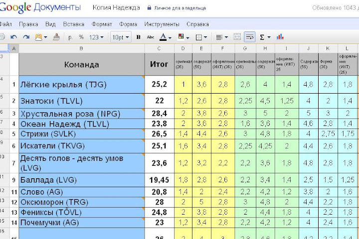 Google Docs для создания "общей тетради"-2. Таблицы Блог тренера / 01.04.2011 В предыдущем посте, посвященном моделям коллективного использования текстовых документов с использованием сервиса Google Docs, среди прочих идей, была предложена идея онлайн-мозгового штурма. Но его можно организовать и в другом, более упорядоченном и структурированном виде - в формате таблицы. Сегодня поговорим о возможностях табличного редактора в Google Docs, о том, как его можно использовать коллективно. И попытаемся ответить на вопрос, в чем могут состоять преимущества именно совместного заполнения таблиц.Мозговой штурм... в таблицеВ отличие от текстового, табличный шаблон заранее можно разработать так, чтобы места для вклада каждого, так сказать, зоны личной ответственности, были определены заранее. Это решение особенно актуально в условиях большого числа участников и при дефиците времени, отведенного на выполнение конкретной работы. Скажем, в "шапках" таблицы - по горизонтали - этапы штурма, а по вертикали - группы под номерами/команды со своими названиями. В этом случае можно внутри команды еще и распределить работу по этапам/задачам и приступить к ее выполнению всем сразу, синхронно. Каждый будет работать в своей ячейке, таблица будет прирастать на глазах, но в процессе ее пополнения никто никому не помешает, так как каждый отвечает за свою часть! Кроме существенной экономии времени на обнародование результатов, обеспечивается еще и максимальная вовлеченность всех участников. Главное при таком способе - обеспечить побольше точек доступа - компьютеров, подключенных к Интернету .Этот же вариант будет хорош не только для групповой, но и для индивидуальной работы, когда вместо групп, в ячейки вертикального оглавления вписываются имена участников. Еще одно преимущество онлайн-штурма - принципиальная возможность поддержки асинхронного и дистантного режимов, что при организации штурма "в реале" - почти недостижимо.Совместная работа над большим табличным документом. Фасилитация!Здесь имеется в виду, что в созданной организаторами форме не просто задан алгоритм для проведения некой групповой работы, а предполагается коллективная разработка и пополнение табличного документа, в соответствии с которым будут потом работать все участники события, например, проекта или конкурса, сверяя свои ожидания с коллективно наработанными общими представлениями. Иногда такой процесс - приобщения разных участников к общей работе над единым документом за счет структурированного и интенсивного обмена предложениями - называют фасилитацией. Одним из наиболее актуальных на сегодняшний день примером для учителя является разработка критериев оценивания сетевого проекта/коллективного продукта. Это именно таблица, в которой есть место для критериев оценивания и для индикаторов, обозначающих разные уровни результативности участия. Образцы подобных таблиц можно найти и в Сети, например здесь, но важно понимать, что совместная разработка критериев оценки, в том числе, и в модели "учитель вместе с учениками", может стать важной частью процесса формирующего оценивания. Поэтому так важно учиться разрабатывать свои собственные модели мониторинга и оценки, а не только копировать уже имеющиеся. А для конструирования таких таблиц - Google-таблицы - подходящий инструмент, с его помощью модел
